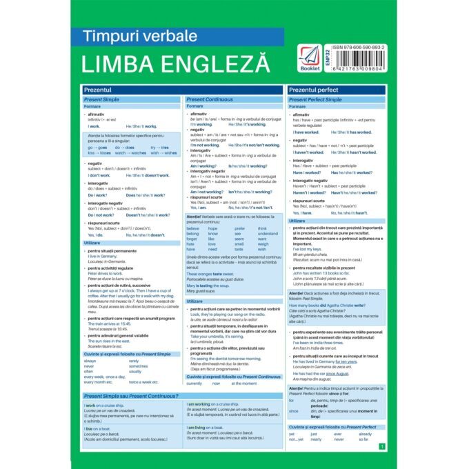 Pliantul conține informații despre formarea și utilizarea celor mai importante 12 timpuri verbale precum și cuvintele și expresiile cu care sunt folosite.